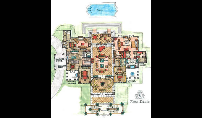 The Rush Residence is designed as a 3 story magnificent Italianate Palazzo on a premier lot on Lake McQueeny / Guadeloupe River Texas. With expansive water views on 1 side, the exterior is of mottled plaster accented with limestone columns, architraves and balustrades. Exquisite iron and glass entry doors are set beneath a columned loggia atop a raised limestone plinth surrounded by sweeping step’s with stone fountain patios and stone pergolas flanking the entrance loggia. The grand entrance hall with its granite floors, and crystal chandelier is dominated by a sweeping grand double staircase with an art deco iron balustrade curving up to the second floor columned gallery. A doorway centered between the 2 staircases leads to the Living Room with its stone fireplace and expansive water views looks out through 3 stone arched windows to the arcaded Loggia with its stone floor and flanking fireplaces that overlooks the pool below. The Family Room Den has a fireplace and looks directly out for 2 water views. With the Kitchen directly behind the Family Room. This State of the art Kitchen has honed granite countertops and floors, built in wood chopping block, double oven, range, warming bins, sink, built in microwave, dishwasher and plenty of storage and pantry space. The Morning Room is situated behind the Kitchen that captures morning sun through French doors opening onto a stone patio covered with a pergola and accented with a fountain. The Dining Room is of finely stained wood paneling also overlooking the stone patio. On the opposite side is the library / office containing a full bar and separate small office. The Master Suite is entered through double wood doors, with fireplace and stone arched widows have 2 water views. The Master Closet is wood paneled with glass and wood doors, built in chests of drawers and cedar closet also serves as a tornado shelter. The Master bath has marble and granite features, built in vanities, Jacuzzi tub and separate shower and toilet room. All other bedrooms are on the second floor with private bathrooms and closets, exercise room and game room with wet bar. Ground floor holds a 16 car garage. Making the Rush Residence a Family showpiece.